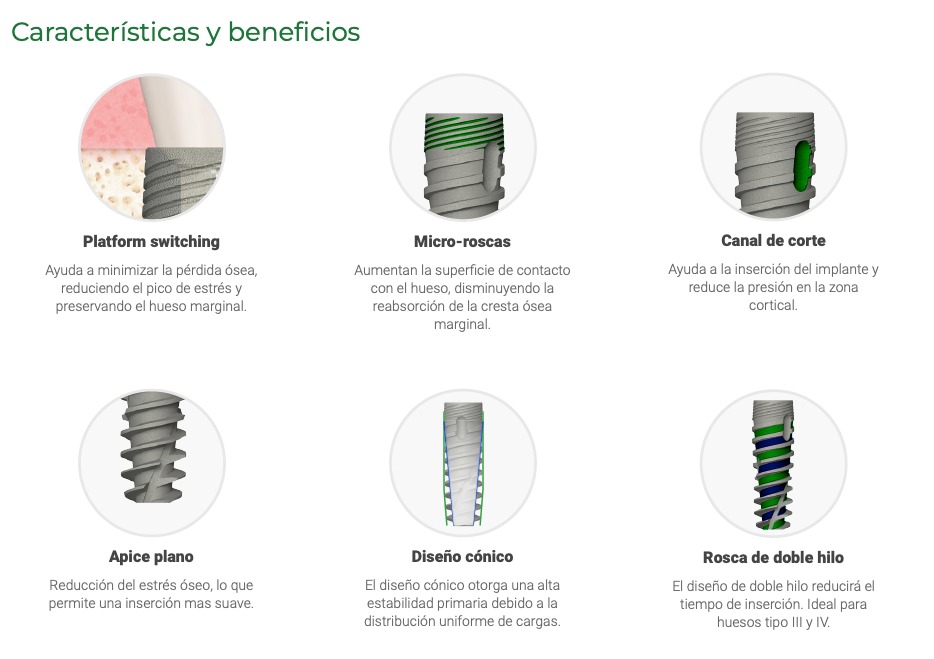 Su diseño se ha realizado pensando en la eficiencia y sencillez de un sistema para todos los casos, teniendo en cuenta la calidad, simplicidad y facilidad de uso. Desde su colocación para carga inmediata hasta protocolos convencionales, para todo tipo de hueso.