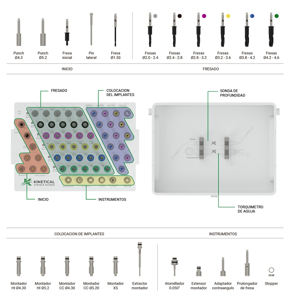 El kit de cirugía guiada Kinetical proporciona precisión y rapidez en el procedimiento quirúrgico. Este ha sido diseñado con una gama completa de fresas e instrumentos para ser utilizado desde la preparación del lecho implantario hasta la colocación final del implante.