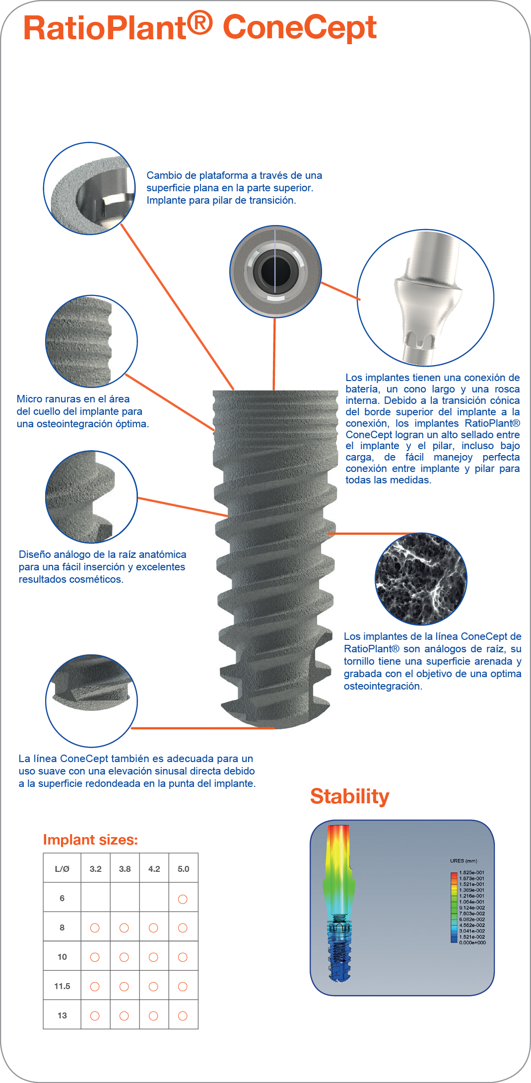La línea RatioPlant® ConeCept son implantes de tornillo análogos de la raíz con superficie pulida y grabada para todas las indicaciones y una excelente cicatrización con una óptima adhesión de osteona favorecida por la superficie nano especial. Las pruebas biomecánicas mostraron una capacidad de carga mucho mayor en comparación con los implantes Avantgarde anteriores. Los implantes tienen una conexión de pináculo, un cono largo y una rosca de acuerdo con la norma estadounidense..
