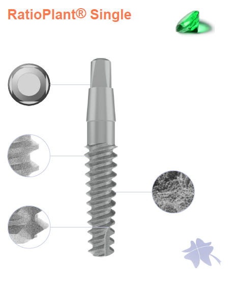 Los implantes dentales se fabrican en titanio, el cual, es un material compatible con el cuerpo y en específico con el hueso humano; por lo que se han utilizado durante muchos años. Diversos estudios han demostrado que la curación y la adhesión del hueso al implante dependen significativamente de la superficie. Como resultado, los implantes RatioPlant® presentan la última generación de superficies arenadas y grabadas. Hay que hacer una distinción entre los implantes, la presentación de los implantes puede ser de dos piezas o de una sola pieza.